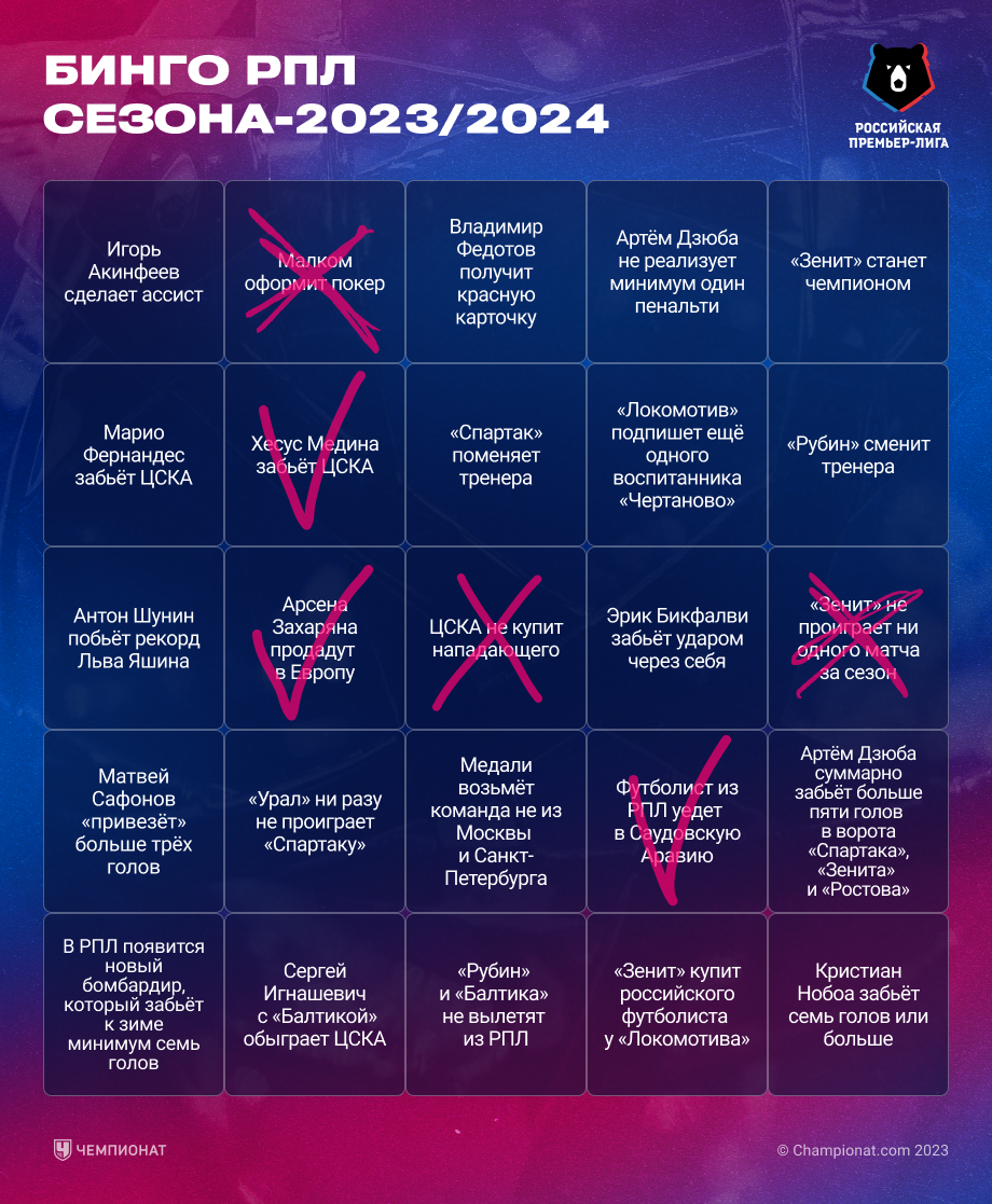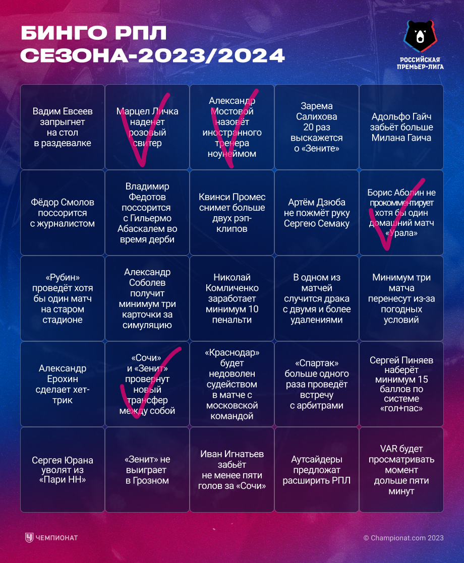 РПЛ интересна сама по себе, но мы придумали, как сделать её ещё увлекательнее. Представляем бинго по сезону-2023/2024. Ниже представлены 50 событий (по 25 на каждой из двух картинок), которые с разной вероятностью могут случиться в РПЛ. Какие-то из них серьёзные и касаются статистики, какие-то — более весёлые и относятся к не совсем футбольным вещам.